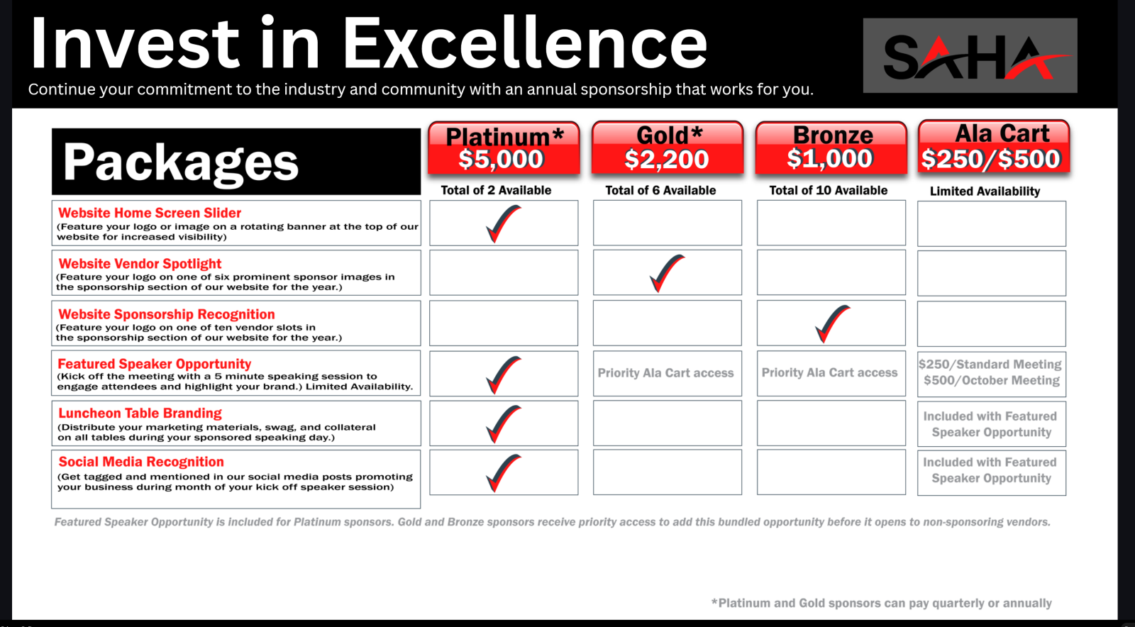 - Throughout the year, SAHA hosts a variety of high-impact events that bring together professionals from every corner of the industry. Event sponsors enjoy valuable face time with decision makers, brand recognition, and the chance to build strong, lasting relationships.