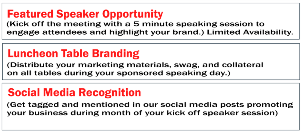 Can also purchase the following add-on with your Gold Sponsorship Package. $250 at a standard meeting or $500 at our highest attended October meeting.